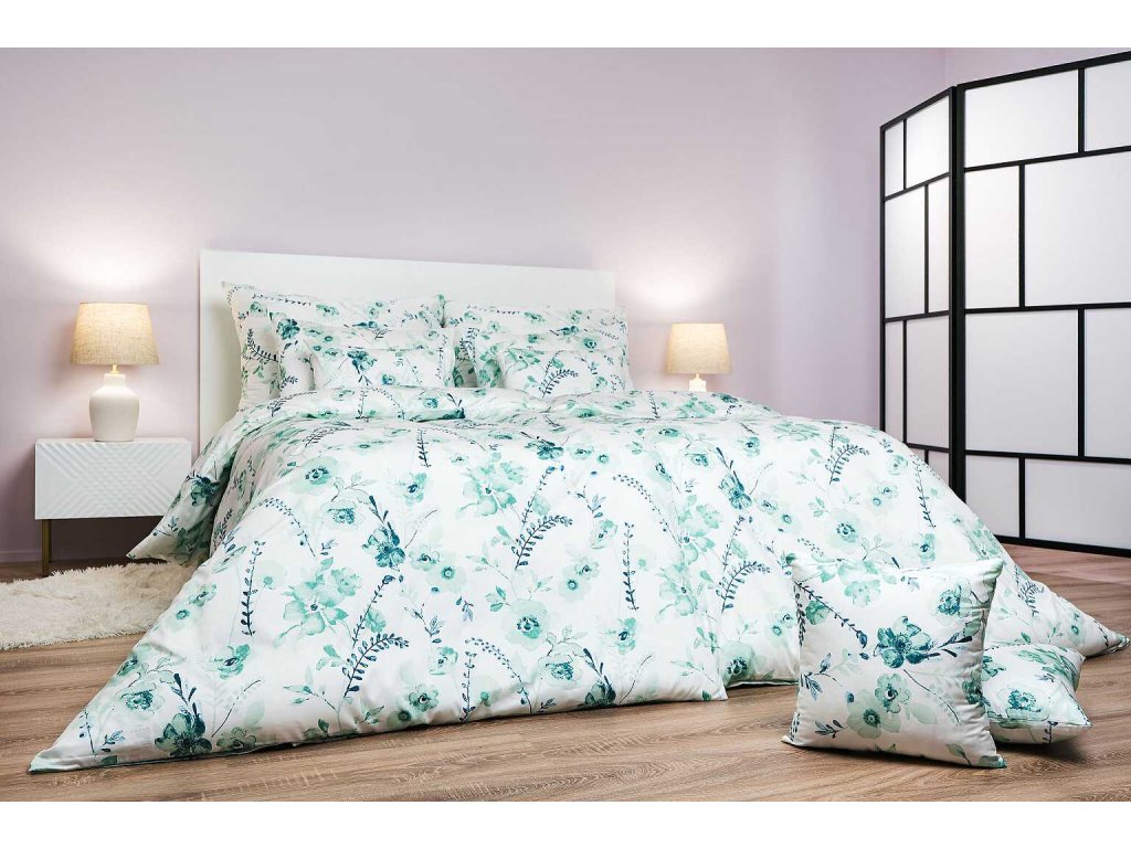 Povlečení satén Kvítí mentolové na bílém 240x220, 2x70x90 cm