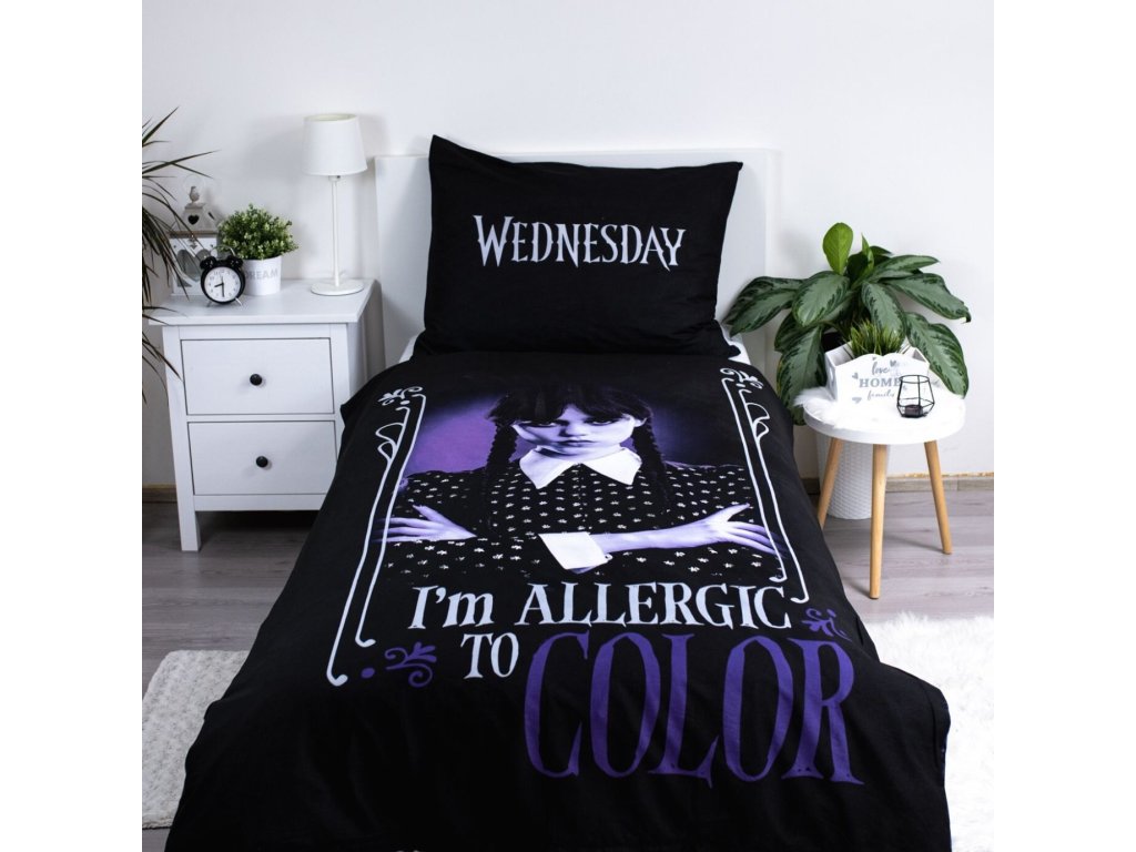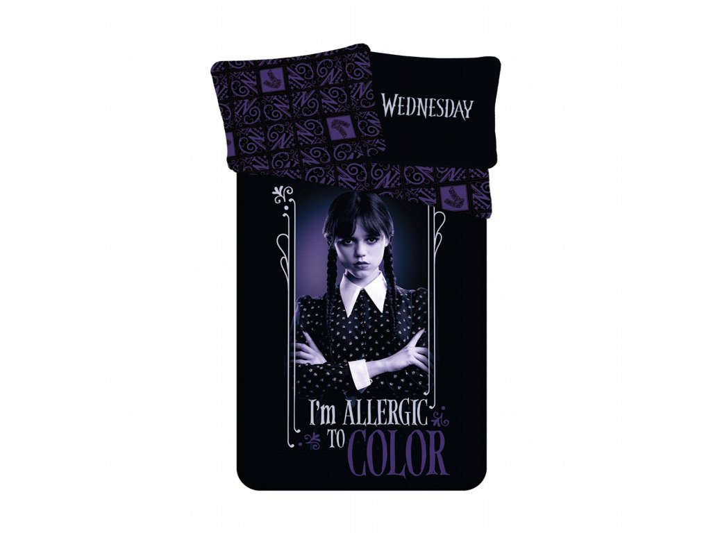 Objevte jedinečný styl s povlečením Wednesday Color! Tento originální design přináší ikonickou postavu Wednesday Addams s typickým výrazem a zkříženýma rukama. Na přikrývce je výrazný nápis „I'm ALLERGIC to COLOR“, který podtrhuje její osobitý postoj. Polštář zdobí jednoduchý nápis „WEDNESDAY“.