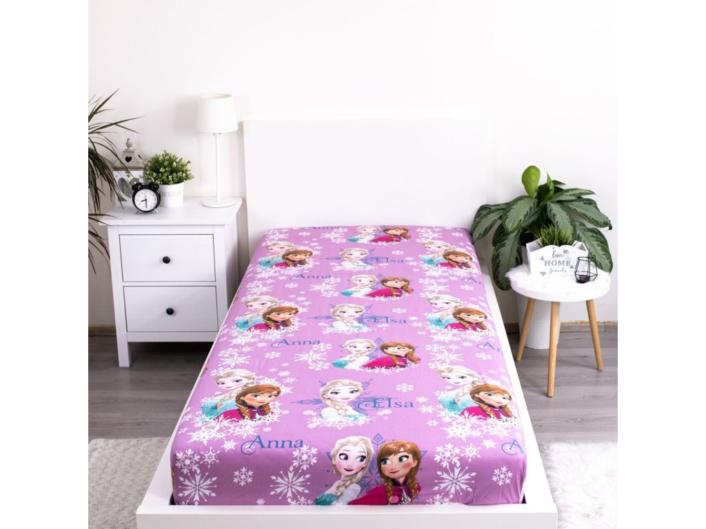 Design je doplněn o nápisy „Elsa“ a „Anna“ v modré a bílé barvě, které ladí s celkovým vzhledem a podtrhují tematické zpracování. Prostěradlo je ideální pro standardní dětské matrace o rozměru 90×200×25 cm a díky elastickým okrajům perfektně drží na svém místě.